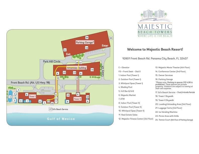 From I-10, take FL-277 SOUTH for 14.2 miles. Then LEFT onto FL-79/S Main St. for 33.7 miles.  LEFT onto Panama City Beach Pkwy for 3.6 miles.  RIGHT onto Clara Ave. for 0.5 mile. LEFT onto Hutchinson Blvd. for 1.4 miles. RIGHT onto Richard Jackson Blvd. for 0.3 mile. LEFT onto Front Beach Rd. for 0.4 mile.  Tower II is the 2nd large building on the RIGHT.  You may stop your car in front of the building to unload, but then must move to the parking garage across the street, and walk back across the pedestrian bridge.